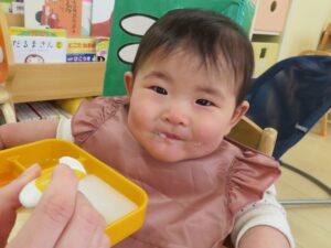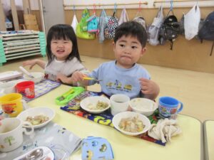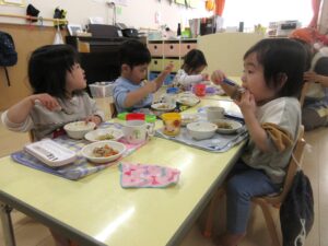 入園、進級おめでとうございます! 新しい環境での生活がスタートしました。 初めは泣いてしまうお友だちが多かったですが今では泣き声も少なくなり笑い声が増えてきました。 初めての給食もモリモリ食べて完食できました!